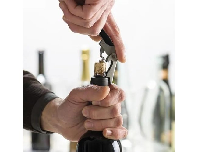 Kit para vinho. Composto por cinco acessórios para vinho em metal e inox, sendo um anel corta-gotas, um funil direcionador com tampa e tampão, ambos com detalhes emborrachados para melhor fixação na garrafa, um termômetro e um abridor saca-rolhas modelo sommelier de alavanca simples com três funções acomodados em um estojo em bambu.