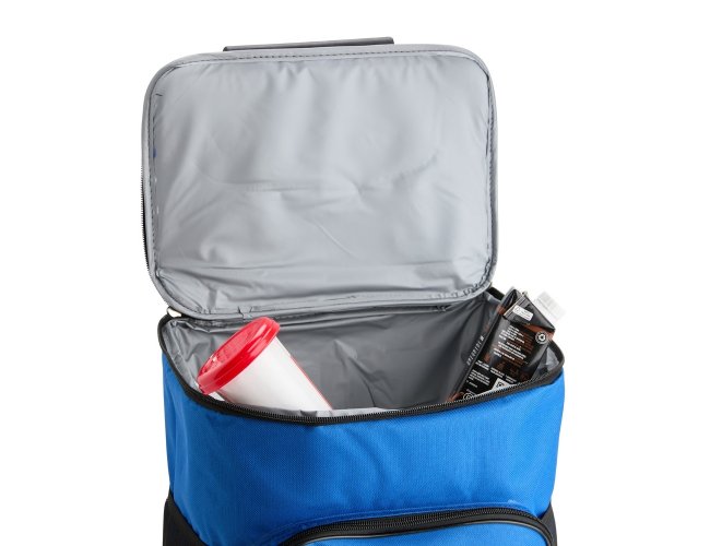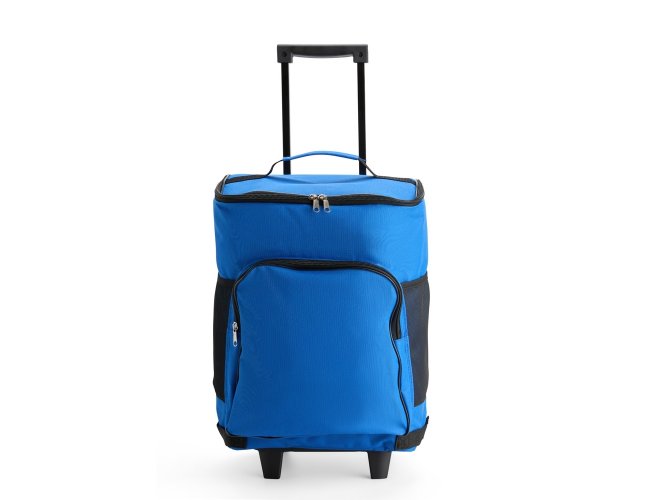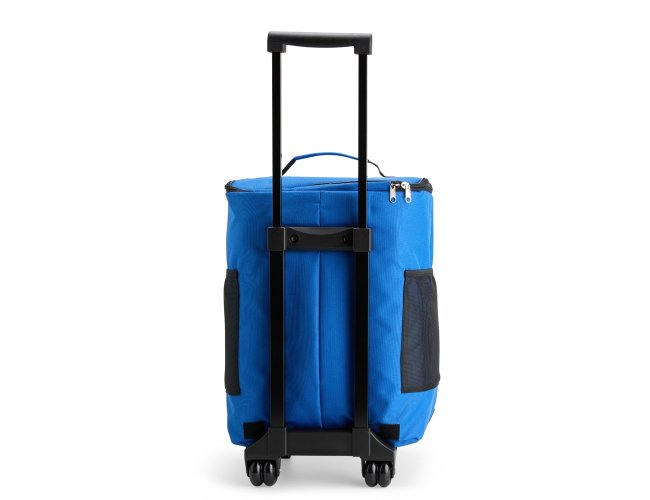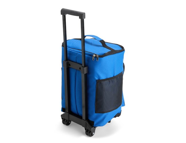 Bolsa térmica confeccionada em poliéster resistente à água e capacidade máxima de 30 litros. Possui compartimento interno com revestimento em PEVA atóxico antivazamento. Dispõe de quatro rodinhas, alça metálica com puxador em plástico, além de freios removíveis com encaixe firme em velcro. Conta ainda com bolso frontal com zíper e dois laterais em tela de nylon.