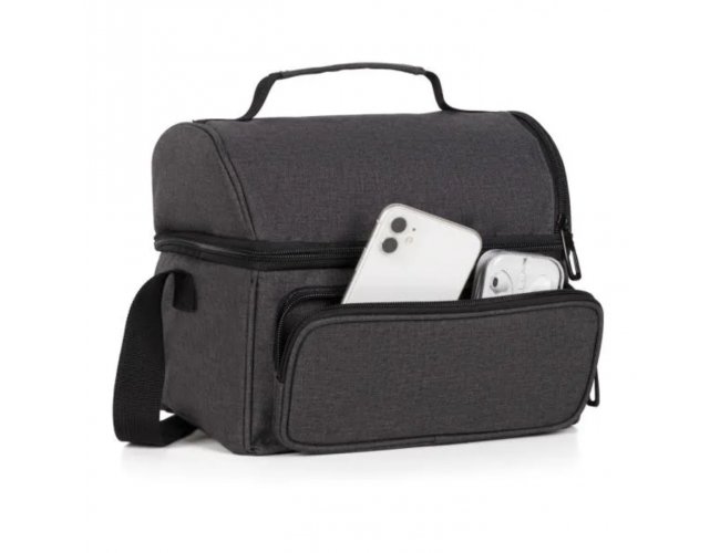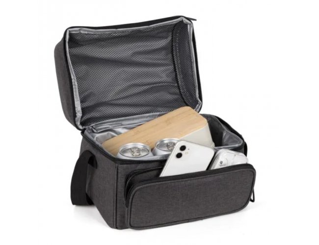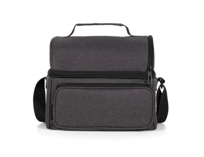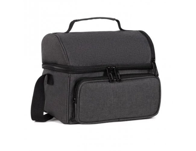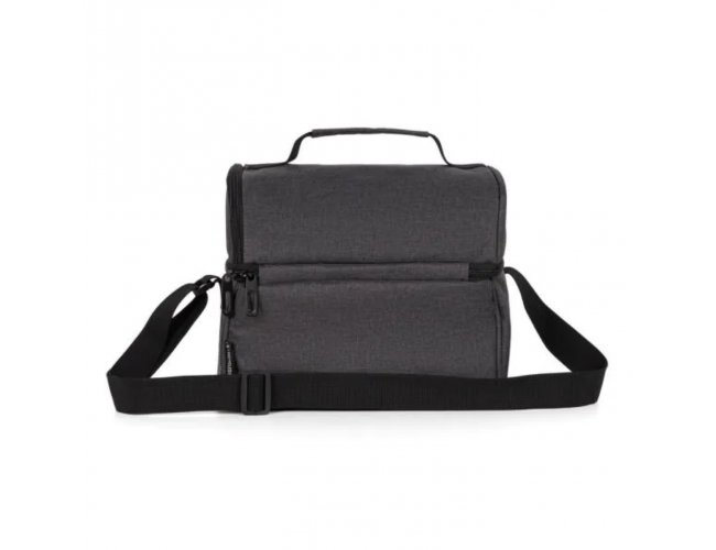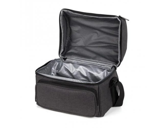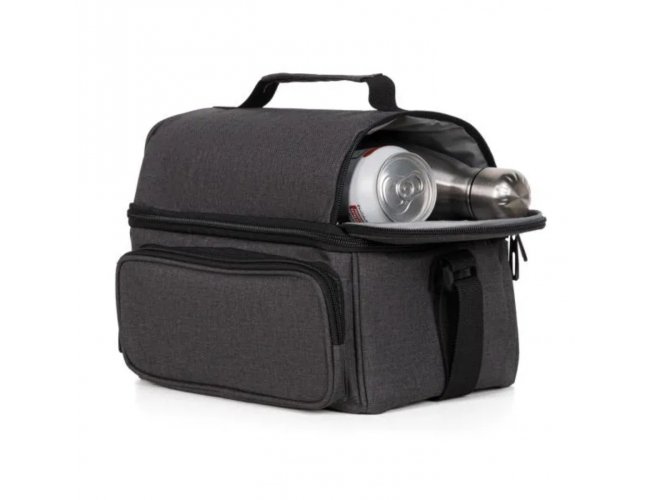 Bolsa térmica cinza escuro em RPET. Conta com dois compartimentos, sendo um frontal e outro principal em material térmico com redinha para melhor divisão e organização, ambos com fecho em zíper. Conta também com alça de mão e alça ajustável.