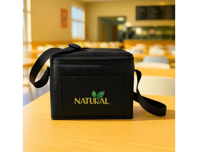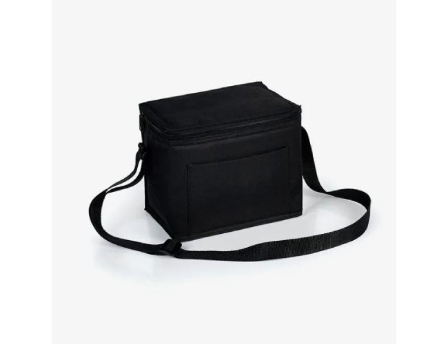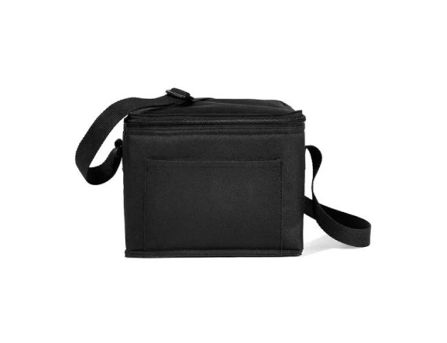 Bolsa Térmica preta em Polyester 600D/PEVA - não impermeável. Conta com alça ajustável, bolso frontal e fechamento em zíper. Forro interno soldado (não vaza) cinza feito de PEVA. Tempo de conservação aproximado: Frio 10 horas / Quente 3 horas.