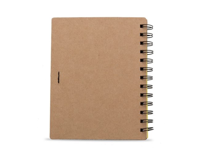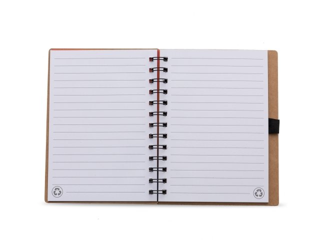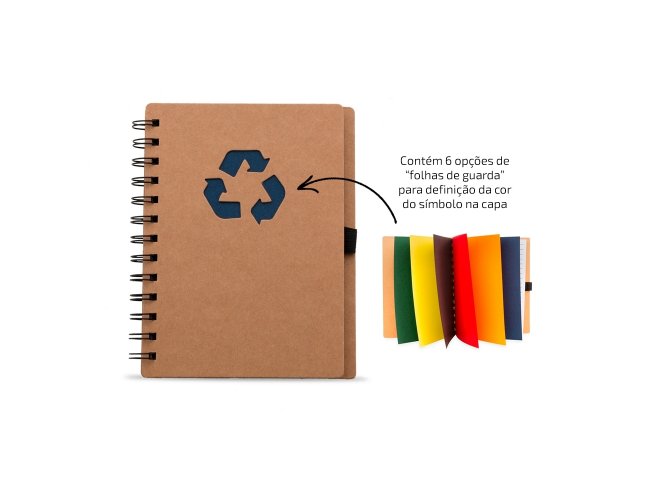 Caderno ecológico com símbolo reciclado na capa, acompanha folhas coloridas estilo folhas de guarda nas cores: vermelho, amarelo, laranja, azul, verde e preto, possibilitando selecionar a cor desejada como fundo do logo reciclado. Possui aproximadamente 70 folhas brancas pautadas com logo reciclado na lateral inferior das folhas, possui também elástico suporte para caneta(não acompanha caneta).