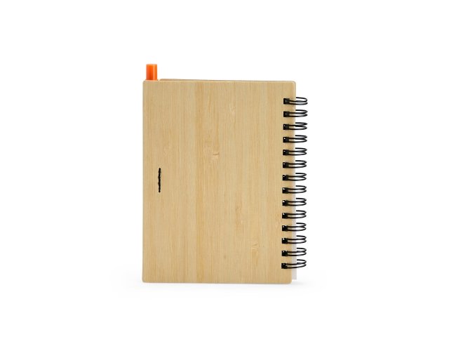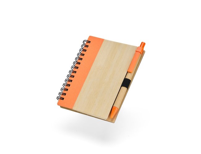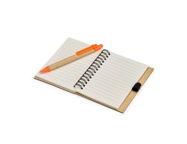 Caderno com capa em casca de bambu, faixa decorativa colorida na vertical, porta-caneta em elástico, encadernação Wire-O e cerca de 70 folhas pautadas. Acompanha uma caneta esferográfica de carga azul de 0,8 mm com corpo em papelão e clip, acionamento em clique e ponteira em plástico.