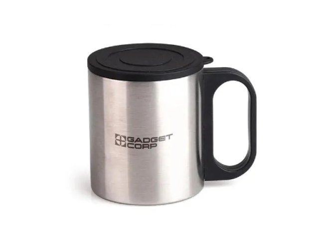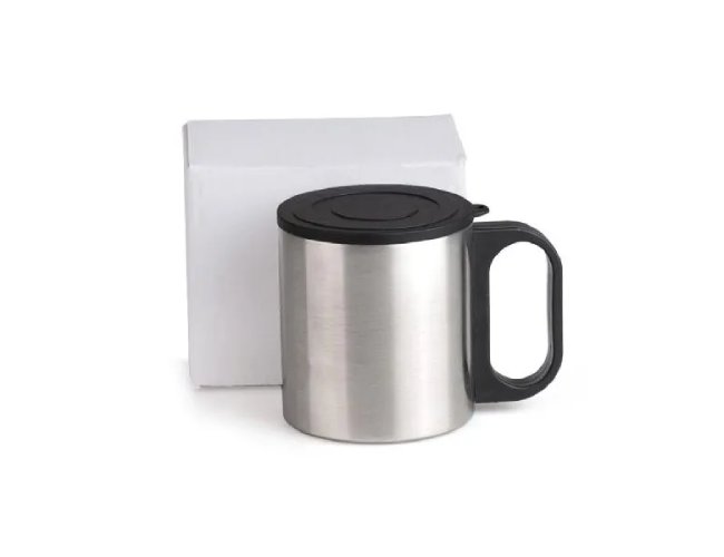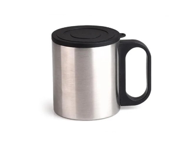 Caneca em aço inox escovado. Conta com tampa preta e alça em plástico.