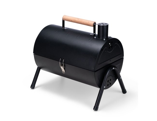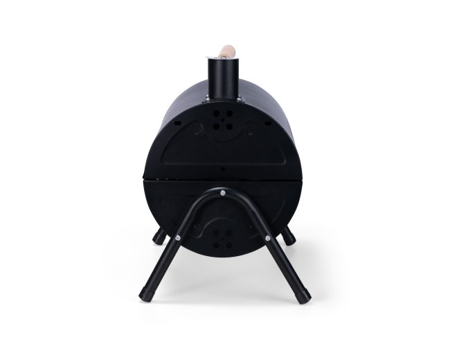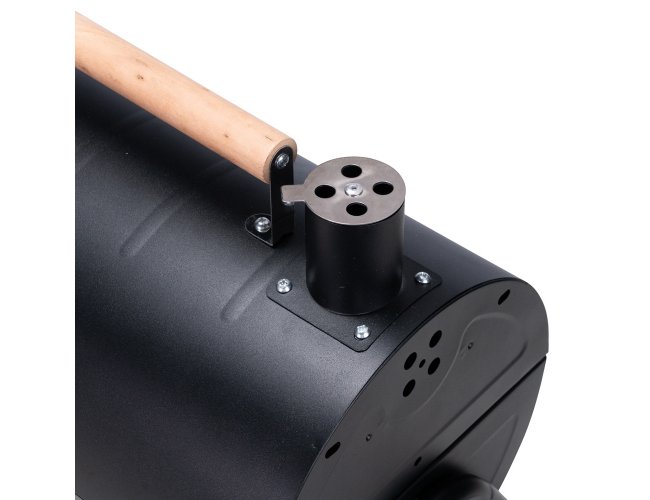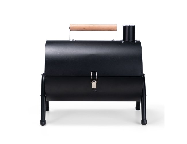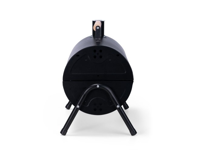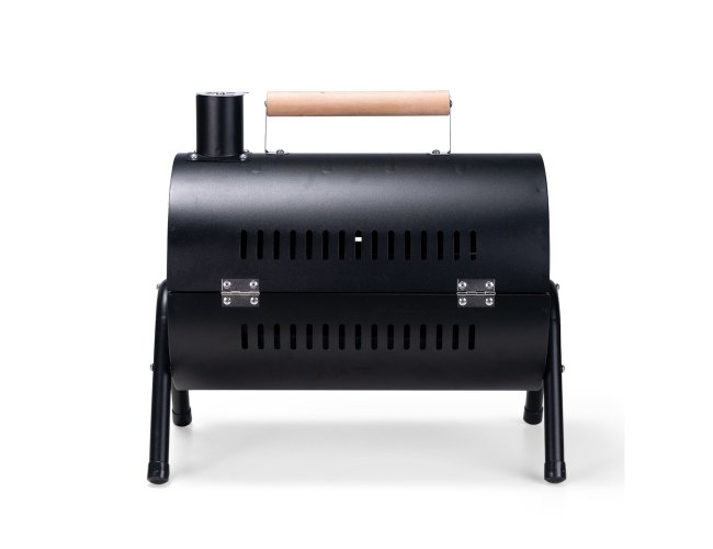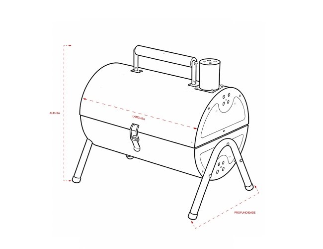 Churrasqueira portátil de formato cilíndrico com estrutura em ferro que permite o uso em duas faces ao mesmo tempo. Possui cabo em madeira de faia, chaminé com regulador, protetor emborrachado para os pés e trava de segurança. Acompanha duas grelhas e duas placas para encaixe interno galvanizado.