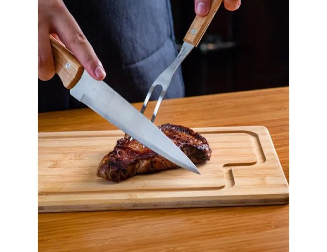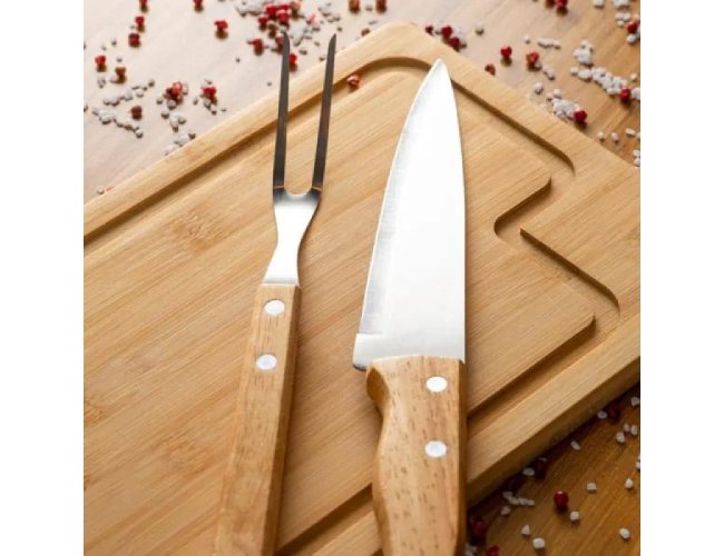 Kit para churrasco; Conta com tábua em Bambu; Faca 7" e garfo em aço Inox/Madeira. Tábua confeccionada com tripla camada invertida, para dar maior durabilidade e não deformar com o passar do tempo. Como cortesia, na faca 7" fazemos uma gravação com os cortes do boi.
