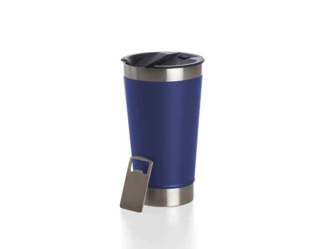 Copo térmico de inox com acabamento liso e capacidade 500ml, material livre de BPA. Contém tampa com abridor.