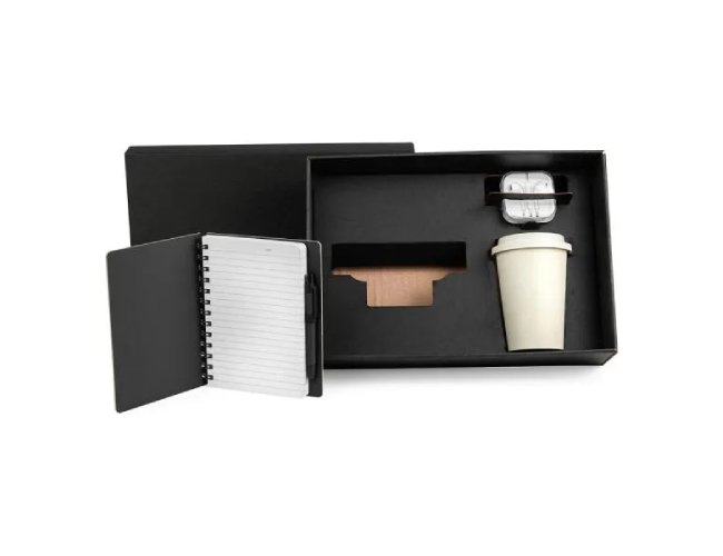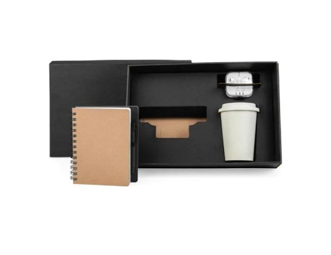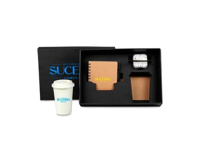 Sugestão de PersonalizaçãoUma gravação em Silkscreen no copo, no caderno e no estojo do fone de ouvido.