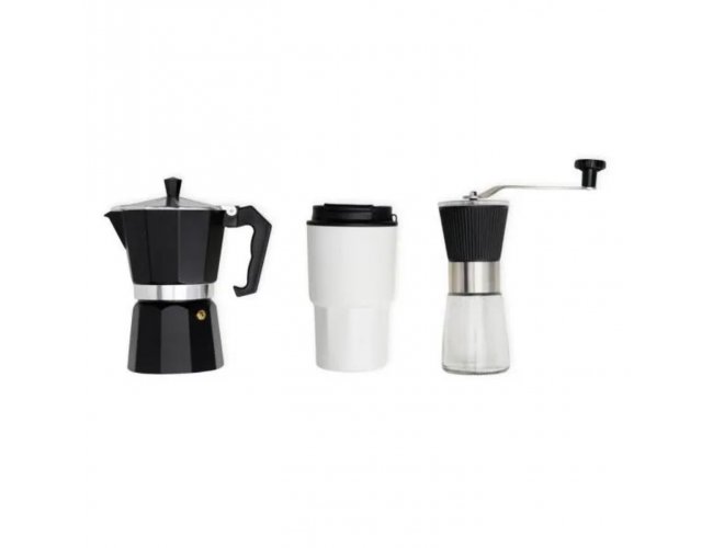 Kit composto por cafeteira italiana; moedor de café em Vidro/Inox e copo térmico branco com tampa.