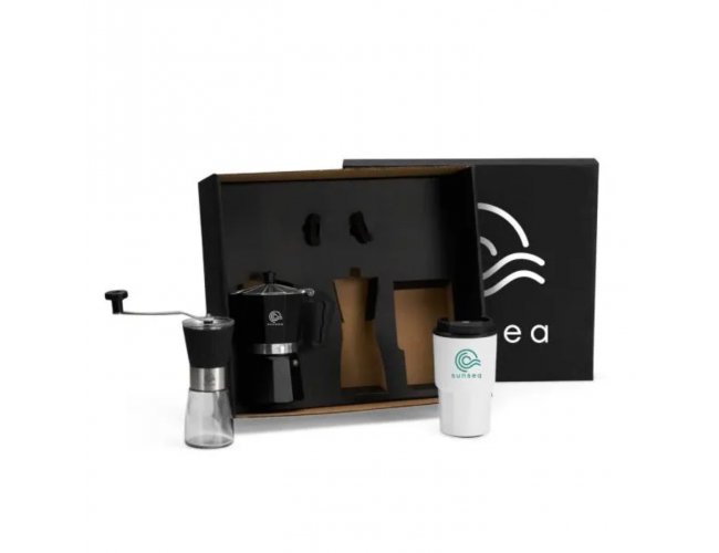 Sugestão de PersonalizaçãoUma gravação a Laser na cafeteira, moedor e copo; uma gravação em Silk/Digital na tampa da caixa.