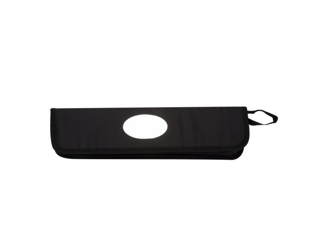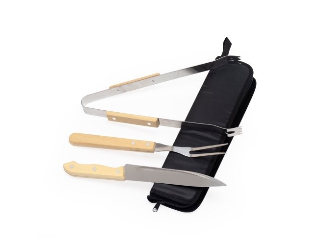 Kit churrasco formado por três itens em inox e detalhes em madeira: faca de 8 polegadas, um garfo de duas pontas e um pegador de alimentos, todos acomodados em um estojo em nylon com alça para transporte. Acompanha plaquinha adesiva personalizável.