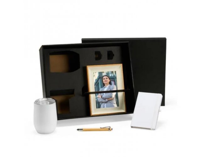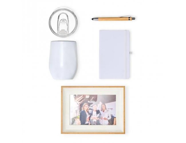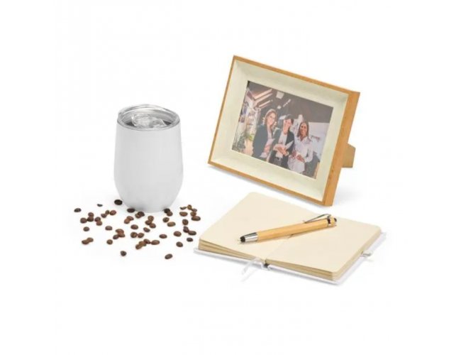 Composto por copo térmico branco com tampa 340ml; porta retrato em mdf; caderno para anotações branco com capa dura; caneta esferográfica em Bambu com ponta touch.
