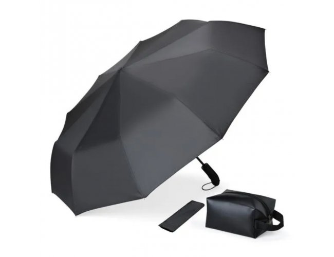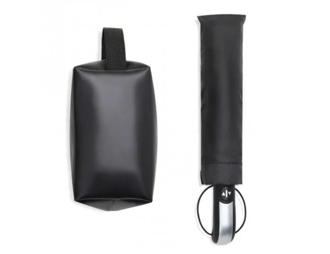 Kit necessaire e guarda-chuva. Composto por guarda-chuva confeccionado em Nylon 190T na cor preta com ativação automática ao pressionar um botão, tanto para abrir quanto para fechar, empunhadura confortável com elástico para fixar no pulso, diminuindo o risco de queda e aumentando a segurança; necessaire com alça em material sintético na cor preta.