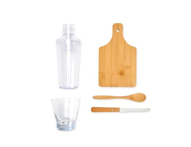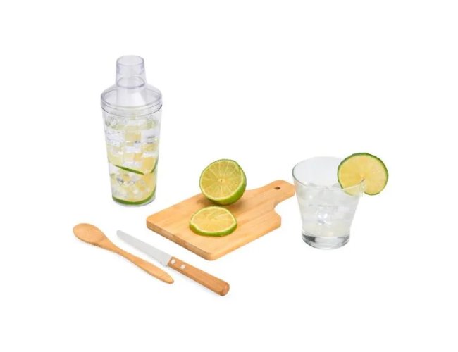 Kit para Caipirinha. Composto por tábua e colher de 18 cm em Bambu; faca 4" em Madeira/Inox; copo em vidro 350ml e coqueteleira em PS.
