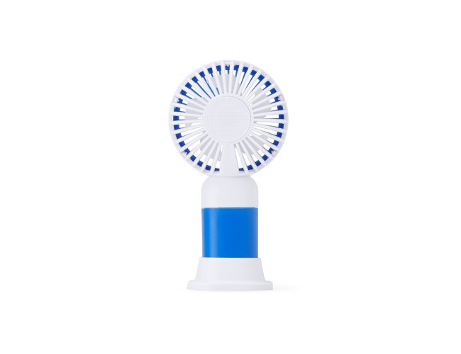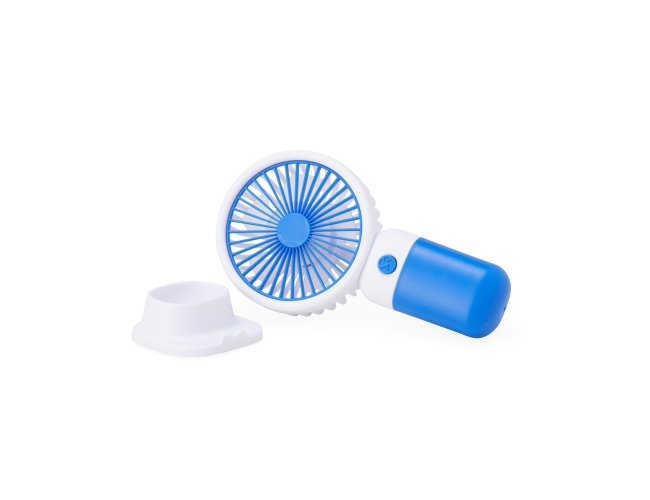 Mini ventilador plástico recarregável com base removível e botão de acionamento. Acompanha cabo usb.
