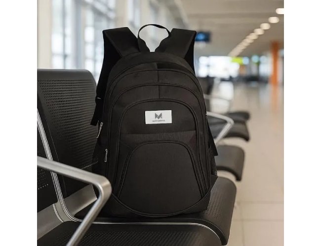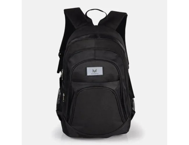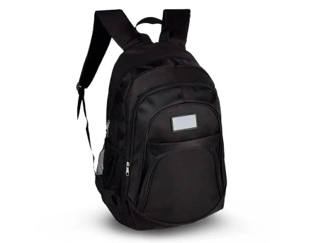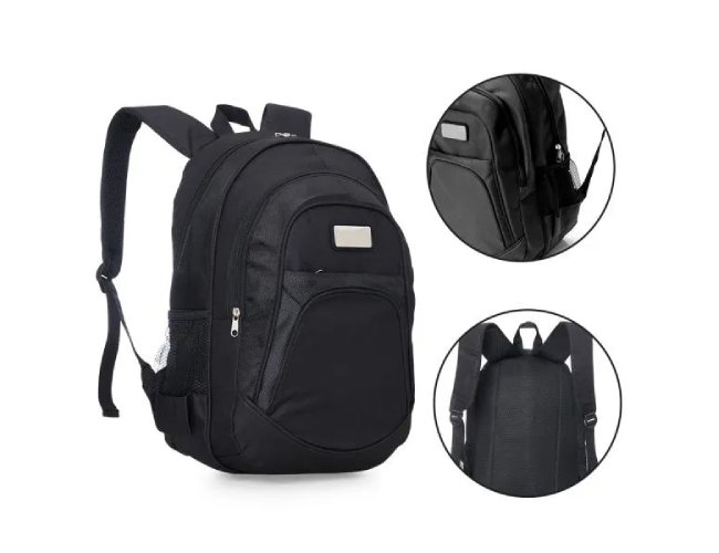 Mochila preta em Poliester 600D/1680D com alças para as costas, alça para as mãos, compartimento para notebook de até 15", 3 bolsos externos com zíper e 2 bolsos externos em tela.