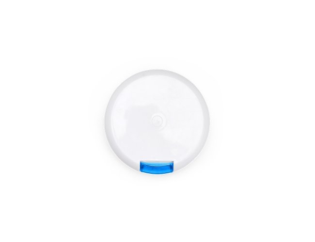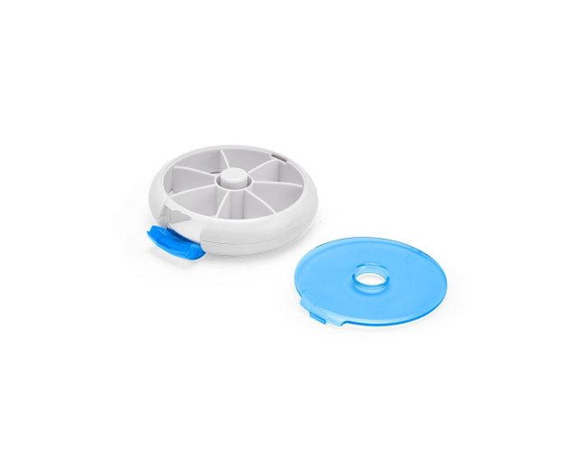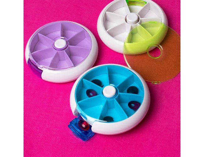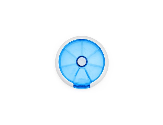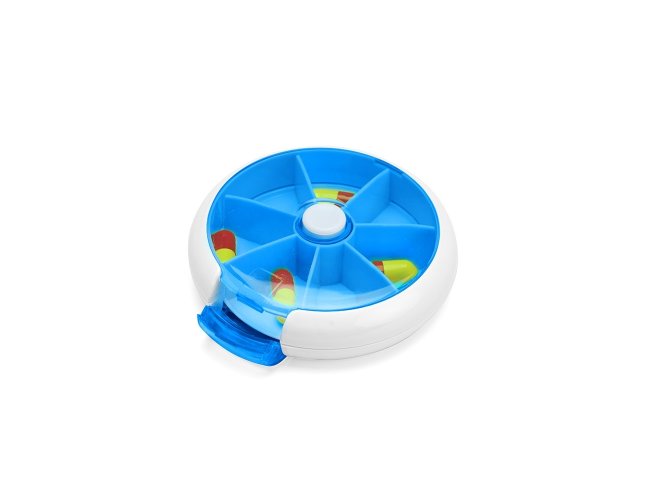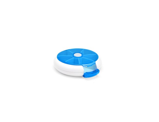 Porta-comprimidos em plástico. Com design compacto, possui sete divisórias e um botão de acionamento que movimenta o mecanismo de giro de compartimentos a cada clique.permitindo o acesso ao conteúdo por meio de uma abertura lateral.