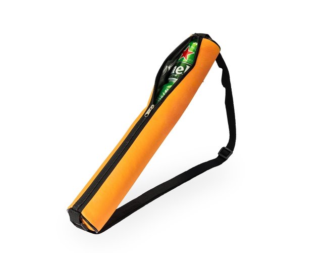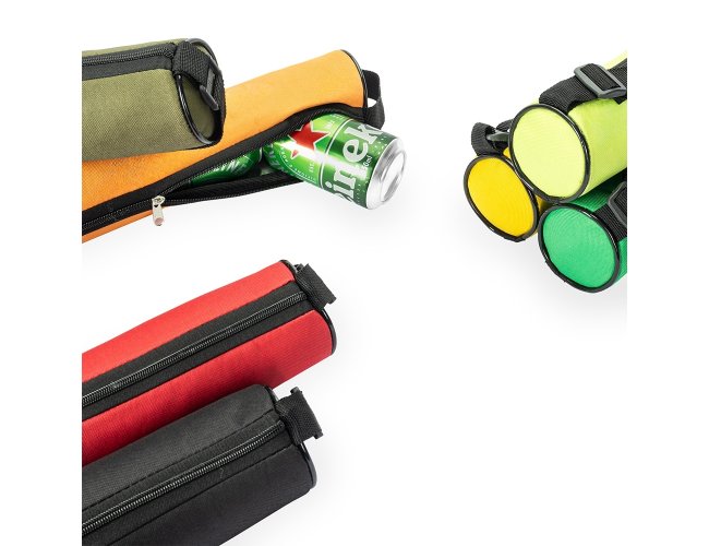 Bolsa térmica porta-latas confeccionada em poliéster resistente à água com capacidade para até quatro latas de 350ml. Possui revestimento térmico interno em PVC prateado com acabamento em verniz, que mantém a temperatura das latas por mais tempo. Conta ainda com alça transversal ajustável.