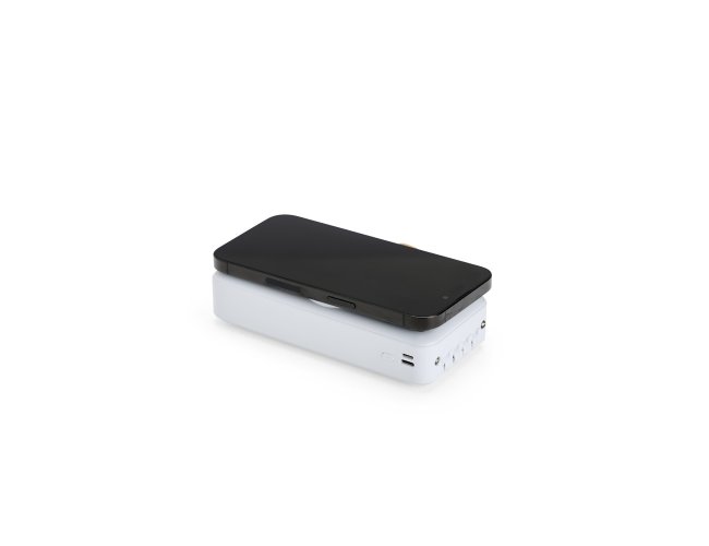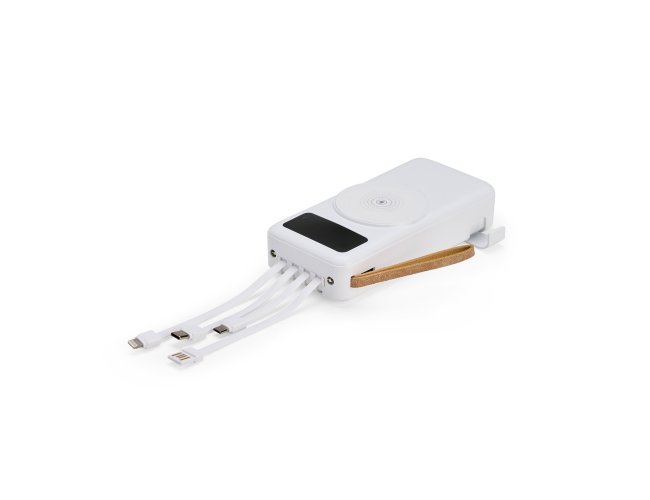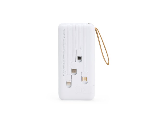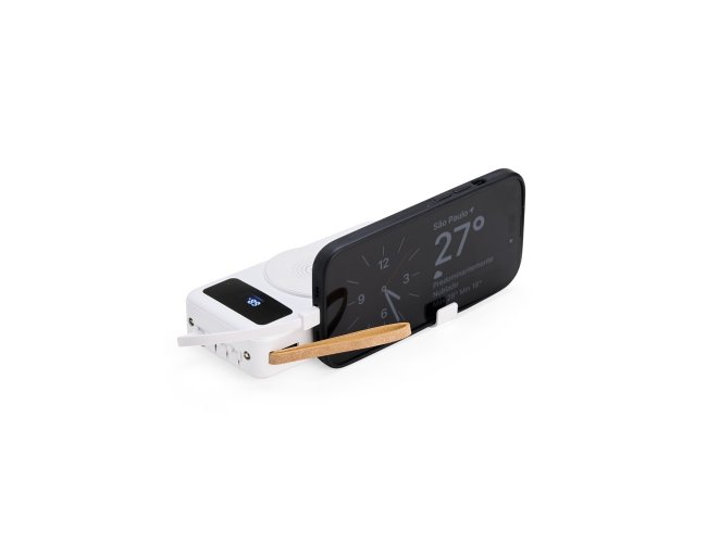 Power bank em plástico com capacidade de 20.000mAh, painel de LED que indica o percentual de bateria, alça em couro sintético para transporte e suporte lateral que permite apoiar aparelhos na horizontal. Possui quatro cabos acoplados, incluindo: USB-C, Micro USB, Lightning e Cabo USB, além de espaço reservado para carregamento por indução de aparelhos compatíveis. Dispõe ainda de conexões USB-C, Micro-USB e USB para recarga do próprio dispositivo.