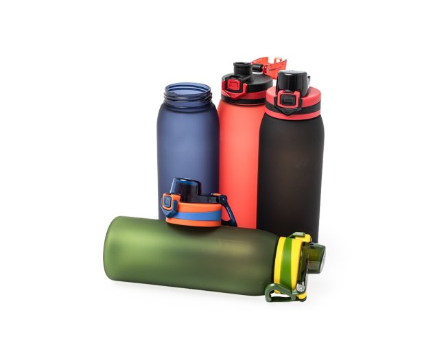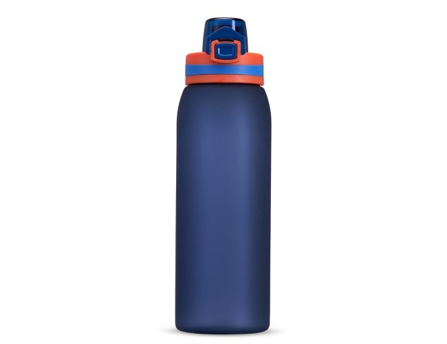Squeeze plástico com capacidade de 900ml. Possui tampa rosqueável com tampa protetora para bocal, trava de segurança com botão de acionamento e alça para transporte. Pintura fosca.